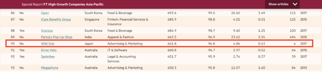 メディアを起点としたブランディングカンパニーである株式会社Wild Side(本社:東京都港区、代表取締役:手代木 達、以下、Wild Side)はこの度、アジア太平洋地域における急成長企業ランキングのトップ500社を選出する「FT ranking: High-Growth Companies Asia-Pacific 2023(アジア太平洋地域における急成長企業ランキング2023)」において、アジア90位(Advertising & Marketing部門5位)、日本14位(Advertising & Marketing部門2位)にランクインしましたので、お知らせいたします