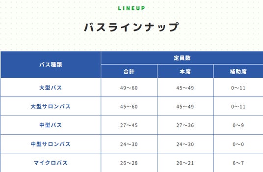 当社がご案内できるバスのラインナップを詳しくご紹介するページを新設しました。大型バスからマイクロバスまで、用途や人数に応じた最適な車両をお選びいただけるよう、座席配置や設備情報を分かりやすく掲載しています。快適な旅をサポートするための充実した設備や、車両ごとの特徴を詳しくご覧いただけるので、ご利用シーンに合わせたバス選びが可能になります。