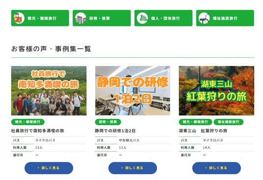 これまで当社のバスをご利用いただいたお客様の事例を紹介するページを設けました。実際の旅行プランや利用目的、参加者の声などを掲載することで、初めてバスを手配する方にも具体的なイメージを持っていただきやすくなっています。企業研修、学校行事、観光旅行など、さまざまなシーンでの活用例をご紹介しており、ご自身のご利用シーンに合った参考情報としてお役立ていただけます。