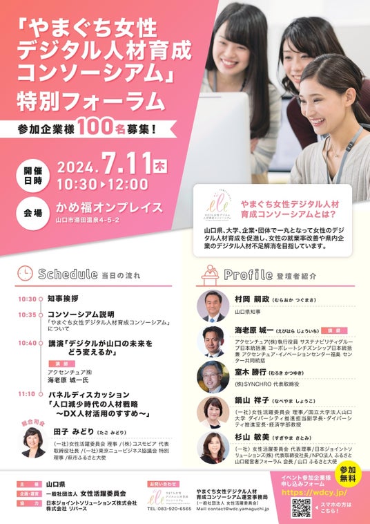 コンソーシアムへの参加(賛助会員)にご興味いただけます企業様におかれましては、下記、「やまぐち女性デジタル人材育成コンソーシアム」特別フォーラム参加申し込みのフォームより、お申込みをお願いいたします。