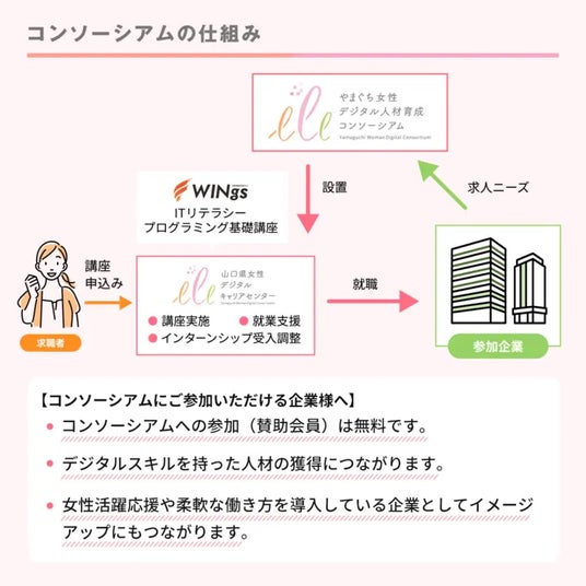 山口県、大学、企業・団体で一丸となって女性のデジタル人材育成を促進し、女性の就業率改善や県内企業のデジタル人材不足解消を目指して、令和5年度に「やまぐち女性デジタル人材育成コンソーシアム」を設立しました。