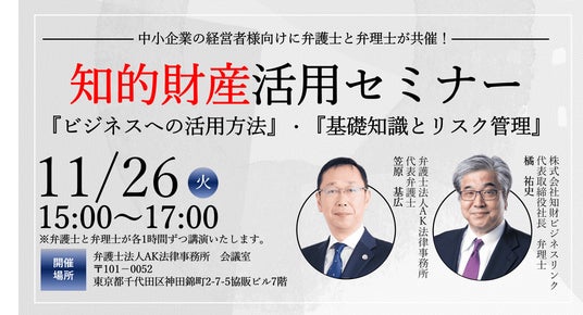 今回のセミナーでは、「知的財産をビジネスに生かす方法」について弁理士がお伝えし、「知的財産の基本的なリスク管理」について弁護士が過去の企業における、具体的な知的財産の事例をもとに、違反となる行為や発覚した場合の法的な影響と適切な対応策についてお伝えいたします。