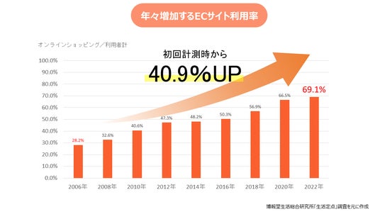 近年、EC市場は急速に拡大し、2023年にはBtoC EC市場規模が22兆円を突破しました。博報堂生活総合研究所の調査によると、2022年度のネットショッピング利用者は全体の約7割に達し、ECサイトの利用は年々増加しています。