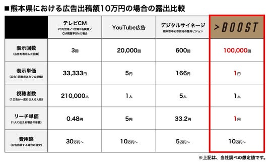 熊本県内での販促プロモーションを行う場合、主要となるマスメディア、WEB広告、屋外のデジタルサイネージと比較してみても、同じ出稿金額で換算すると表示回数やリーチ単価については非常にコストパフォーマンスに優れた広告メディアであると考えます。