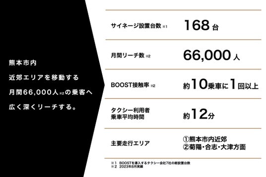 株式会社おしろタクシー(本社:菊池郡菊陽町 以下、当社)は、2024年2月1日より、熊本県下初となるタクシーサイネージメディア「BOOST」のサービスを開始しました。