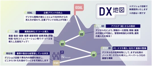 本サービスでは、まず、企業のDXの現状を把握し、ゴール設定を行うための「デジショク診断」を行います(無料)。この診断結果をもとに「DX地図」を策定し、それぞれの企業の実情に合わせたDX推進施策を提案し、その旗振りから実行・システム導入、保守運用管理までをワンストップで行います。