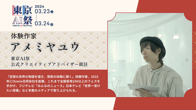 2024年3月23日(土)、24日(日)に渋谷ストリームホールにて開催される「東京AI祭」のクリエイティブアドバイザーに、2024年1月より体験作家のアメミヤユウ氏が就任いたします。