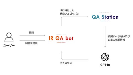 本日、両社の取り組みの成果として「IR QA bot(β版)」をリリースするに至りました。IR QA botは、GPT4oをベースとしつつ、QA Station内の質疑応答の情報を検索する仕組みやその他独自のアルゴリズムを組み込むことで、各社の個別事情を踏まえた回答を自動生成することを実現しています。た。