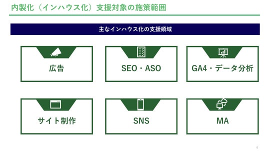 広告、SNS、SEO、データ分析、サイト制作などデジタルマーケティング業務におけるインハウス化(内製化)に関わることであれば、いずれも対応可能です。