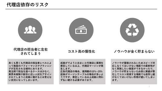 また自社内にノウハウが貯まらず全て代理店の資産になってしまうこともデメリットです。代理店に全てアウトソースしていて、月次や週次のレポートのみを受け取っている状態では