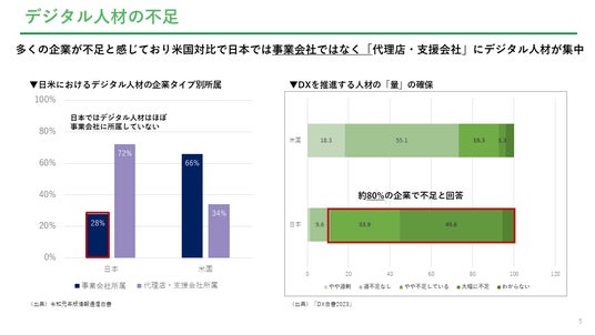 左の図は米国と日本それぞれでデジタル人材が事業会社と支援会社に所属している割合を表したものです。