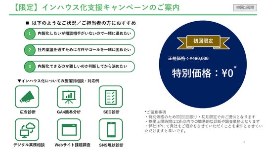 先着5社限定で初月0円の内製化(インハウス化)支援をキャンペーンを実施しています。