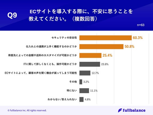 「Q9.ECサイトを導入する際に、不安に思うことを教えてください。(複数回答)」(n=63)と質問したところ、