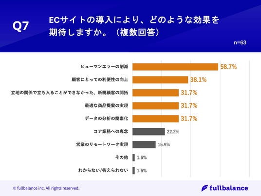 「Q7.ECサイトの導入により、どのような効果を期待しますか。(複数回答)」(n=63)と質問したところ、