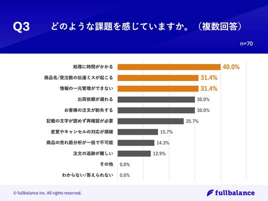 「処理に時間がかかる」が40.0%、「商品名/受注数の伝達ミスが起こる」が31.4%、「情報の一元管理ができない」が31.4%という回答となりました。
