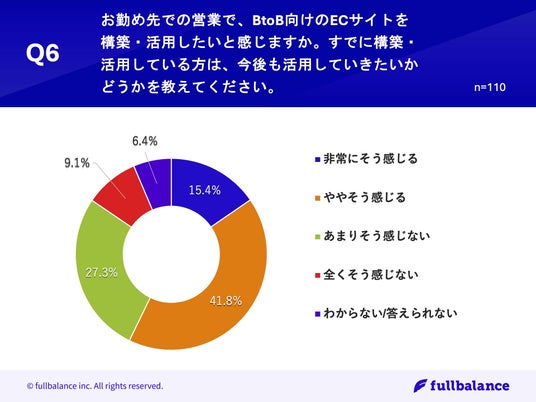 「Q6.お勤め先での営業で、BtoB向けのECサイトを構築・活用したいと感じますか。すでに構築・活用している方は、今後も活用していきたいかどうかを教えてください。」(n=110)と質問したところ、