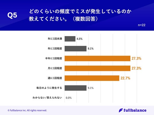「Q5.どのくらいの頻度でミスが発生しているのか教えてください。」(n=22)と質問したところ、