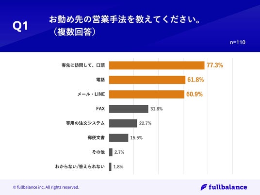 「Q1.お勤め先の営業手法を教えてください。(複数回答)」(n=110)と質問したところ、