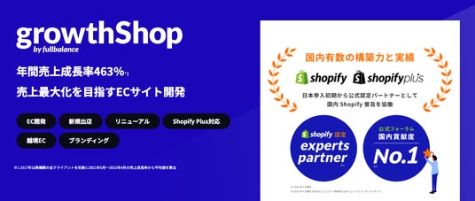 ◼️年間売上成長率463%*!Shopify公式認定パートナーとして実績多数のEC事業構築パッケージ「grothShop」とは