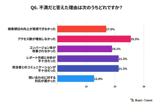 これは、「調査結果5.」において満足した理由で最も多かった回答でもあり、他の選択肢と比較しても全体的な比率は大きく変動していないことから、SEOコンサルティングの成果として求められていることはある程度の一貫性があることが伺えます。