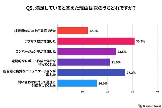 また、調査結果1.でSEOコンサルティング会社に期待されていた「コミュニケーションの質」も満足度に大きく関わっており、次点の27.2%の回答を集めました。