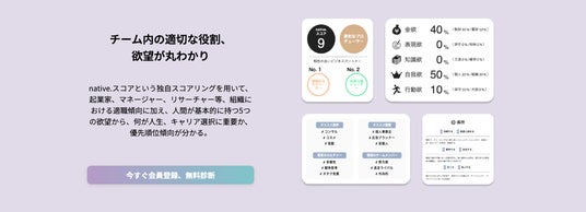 さらに、「native.スコア」という独自のスコアリングシステムを導入し、起業家、マネージャー、リサーチャーなど、組織における適職傾向と、人生・キャリア選択において重要となる5つの欲望の優先順位傾向を把握することができます。