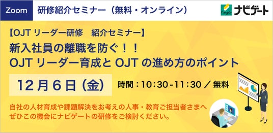 社員研修と業務マニュアル制作で人材育成をサポートするナビゲート有限会社(1995年設立、本社:横浜市 代表:伊藤弘二朗)は、2024年12月6日(金)に、OJT指導者の役割、新入社員の受け入れ準備やOJTの進め方のポイントなどをご紹介する無料・オンラインセミナーを開催します。