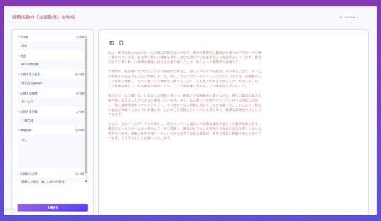 指定された文字数や応募する職種、役職、職種経験などを入力することで条件に合った志望動機が作成されます。