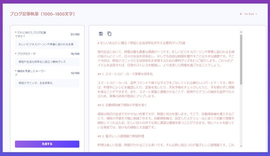 ブログのテーマや、ブログのターゲットを入力することでその内容に適したブログ記事が自動で生成されます。