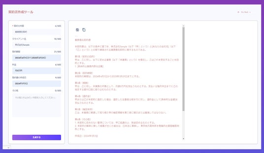契約内容や契約期間などを入力することで、契約書のたたき台が自動で生成されます。