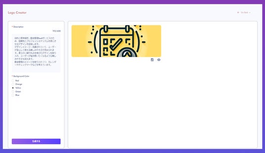 出力したいロゴの要素やデザイン、色味を指定することで企業・サービスに使えるロゴのアイディアが生成されます。