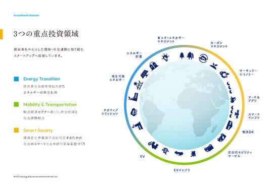 EEI4号・5号ファンドでは、Energy Transition、Mobility & Transportation及びSmart Societyの3つの投資領域を中心に投資を実行しています。脱炭素を中心に持続可能な社会の実現に向け、各領域において先鋭化する環境・社会課題の解決に寄与するスタートアップへ投資を通じ投資リターンの最大化と環境・社会的インパクトの創出の両立を目指して運用しています。当社では、投資先が創出するインパクトの評価を実施し、ファンド全体としてインパクトの創出に取り組んでいます。投資時にインパクトとESGの達成状況を投資実行時に投資委員会にて評価を行い、投資後は定期的にモニタリングを実施し、定量・定性面から多面的に評価を行っています。