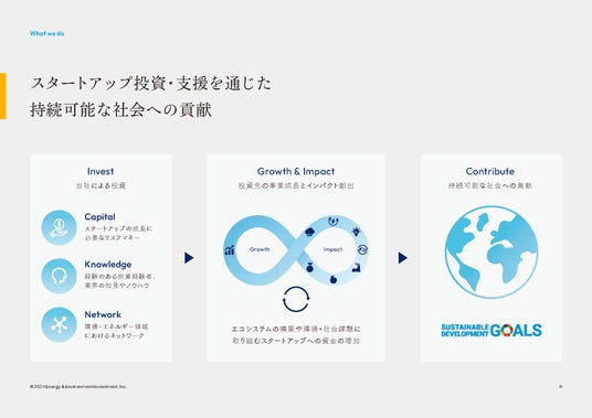 当社は今後もインパクト志向と成長性の高いスタートアップへの投資を行い、投資先企業の成長とと もにより大きなインパクトの創出に貢献すべく、支援してまいります。