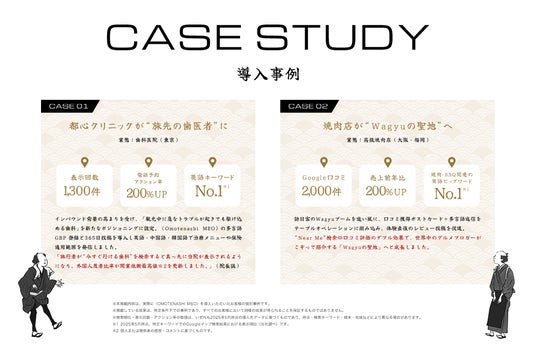 導入企業の事例からも、確かな成果が見て取れます。東京都内の歯科医院では、英語キーワード検索でNo.1※を獲得したほか、電話予約によるアクション率が導入前の2倍にまで跳ね上がりました。また、大阪・福岡に複数店舗を展開する焼肉店チェーンでは、Google口コミ数が2,000件を突破し、売上高は前年比200%増を達成。いずれもインバウンド集客強化におけるOmotenashi MEOの効果を裏付ける好事例です。