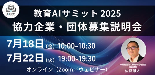 一般社団法人教育AI活用協会(所在地:東京都港区/代表理事:佐藤雄太)は、2025年8月22日(金)に開催する衆議院第一議員会館での「教育AIサミット2025 ~EDU HEROES あなたに託す教育の未来へのバトン~」に向けて、同イベントを共に支える協力企業・団体の募集を開始しました。それに伴い、協力企業・団体向けの募集説明会をオンラインにて実施いたします。