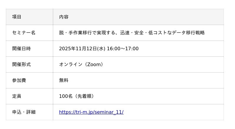 ITソリューションを提供するトライエム株式会社(本社:神奈川県横浜市、代表取締役:三宅 剛)は、クラウド移行やシステム刷新に伴うデータ移行に課題を抱える情報システム部門、DX推進部門の責任者・担当者様を対象とした無料オンラインセミナー「脱・手作業移行で実現する、迅速・安全・低コストなデータ移行戦略」を2025年11月12日(水)に開催いたします。