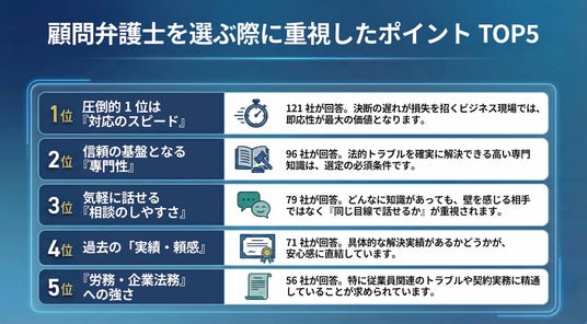 弁護士を選ぶ際に重視したポイントでは、「対応のスピード(121社)」が2位の「専門性(96社)」を大きく上回りました。 決断の遅れが損失を招くビジネスの最前線では、即応性が最大の価値となっています。