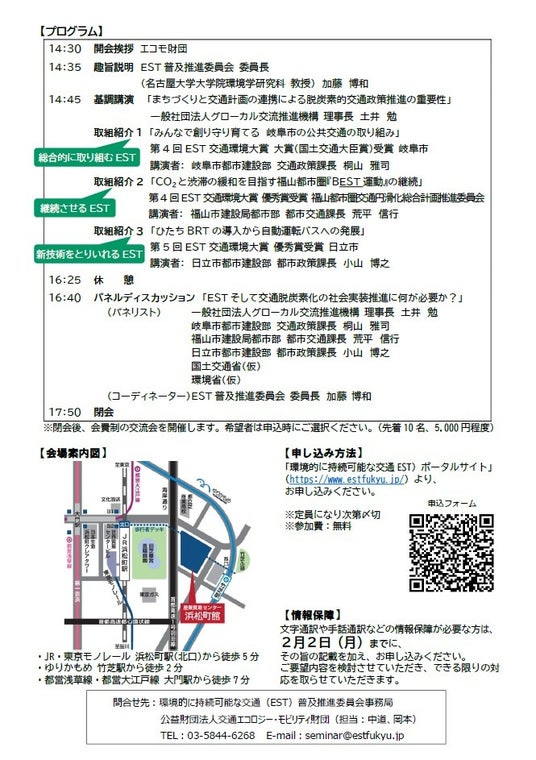 公益財団法人交通エコロジー・モビリティ財団岐阜市、福山都市圏、日立市の優れた取組みの紹介を通じて、「環境的に持続可能な交通(EST)、そして交通脱炭素化の社会実装推進に何が必要か?」を議論します。後援として国土交通省・環境省が加わりました。