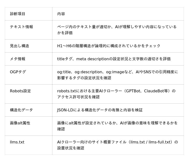 この変化により、自社サービスや商品が「AIに正しく理解され、引用される」ことの重要性が急激に高まっています。しかし、自社のWebサイトがAIにどのように認識されているかを把握する手段は限られており、多くの企業が対応に手をつけられていないのが現状です。