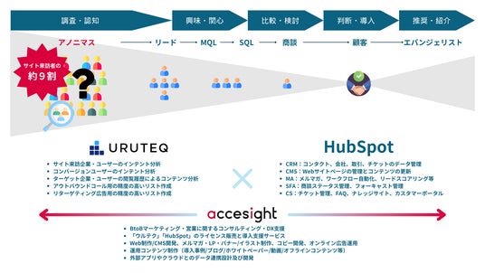 このような背景から、アクセサイトはBtoBマーケティング・営業業務をより最適化するために、ウルテクの販売パートナーおよび導入支援を開始し、さらにこれまで培ったHubSpot導入のノウハウとあわせてアノニマス段階を含めた購買ファネル全体の包括的なサポートを提供します。