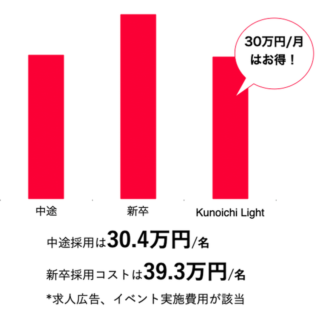 また、採用広報は積み上げ式となるため、KUNOICHIサービスLightの代行運用による文律されたプロセスと成果は十分なアセットとなります。集客の業務負担を軽減し、採用コストを大幅に削減することができます。