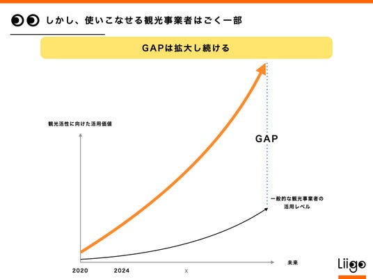 しかしながら、生成AIの進化は爆発的で、私たち自身でもすべての更新情報に追いつくのが難しい状況です。さらに、お客様である観光事業者の間では、技術の活用能力に大きな格差が存在しています。この格差は今後も拡大すると考えられます。
