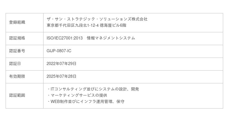 BX/DXを総合的にデザインするデジタルコンサルティングカンパニーであるザ・サン・ストラテジック・ソリューションズ株式会社(所在地:東京都千代田区、代表:藤浪 慧、以下 THE SSS)は、情報セキュリティマネジメントシステム(以下、ISMS)の国際規格であるISO/IEC 27001:2013の認証を取得したことをお知らせします。