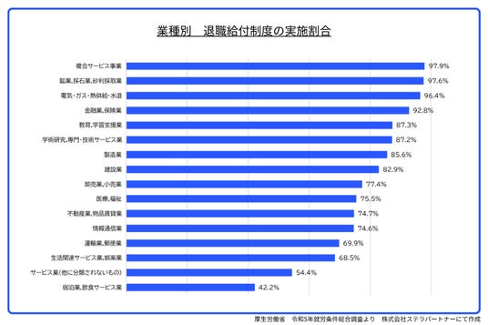 業種によっても退職給付制度の導入率に大きな差が生まれています。生活関連サービス業、娯楽業、宿泊業、飲食サービス業等、労働集約型の業種は退職給付制度が導入されづらい傾向にあるようです。