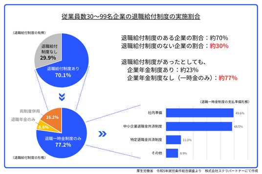 https://www.mhlw.go.jp/toukei/itiran/roudou/jikan/syurou/23/)によれば、退職給付制度がある企業の割合は、大企業が9割を超える一方で、従業員数30~99名の中小企業では7割程度に留まっています。また、退職給付制度を実施していたとしても、ほとんどは社内積立や中小企業退職金共済制度(中退共)のみであり、企業年金制度(確定給付企業年金や確定拠出年金など)を導入している中小企業は非常に少ないのが現状です。