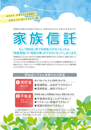 人生100年時代といわれる日本の超高齢化社会。元気なシニアライフを送りたいと皆様が思う一方で、長生きによって発生する「認知症による様々なリスク」が社会問題となっています。認知症になったときに銀行口座や不動産などの「財産」にふりかかる「資産凍結リスク」に対して、事前に家族信託という制度を活用することで、認知症になった本人に代わって家族が資産の管理・運用・処分をすることができるようになります。