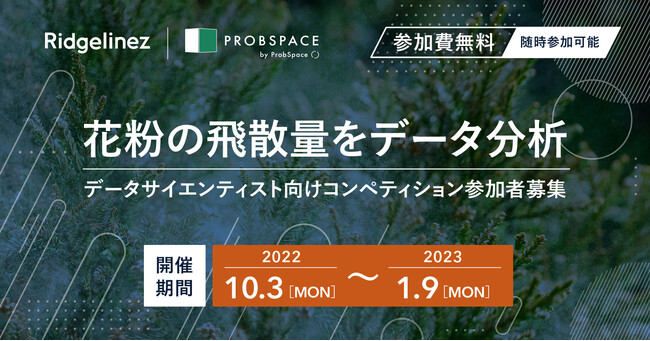株式会社ProbSpace(本社:東京都新宿区、代表取締役CEO:内藤嘉章、以下ProbSpace)は、Riegelinez株式会社(本社:東京都千代田区、代表取締役CEO:今井俊哉、以下Ridgelinez)との共同開催コンペ第2弾として、「花粉飛散量予測」コンペティションを開催しております。