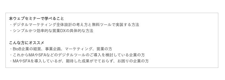 本ウェビナーでは、BtoB企業のマーケや営業の実務担当者が、無料ですぐに取り組める、売上につながるデジタル施策を紹介します。無料でスモールスタートし、失敗を許容しながら試行錯誤するプロセスを経て、社内DX化が推進された事例を、マーケティングパートとセールスパートの2部構成でご紹介します。
