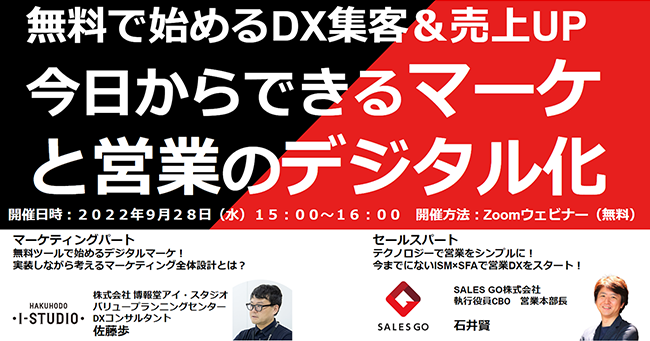 「テクノロジーで営業をもっとシンプルに!」を合言葉に営業支援サービスを展開するSALES GO株式会社(読み:セールスゴー/所在地:東京都品川区/代表取締役社長:内山 雄輝/以下 SALES GO)は、株式会社 博報堂アイ・スタジオ(本社:東京都千代田区/代表取締役社長 兼 CEO 兼 CCO:川又昌弘/以下 博報堂アイ・スタジオ)と、「無料で始めるDX集客&売上UP!今日から始められるマーケと営業のデジタル化」と題したウェビナー(無料)を9月28日(水)に共催します。