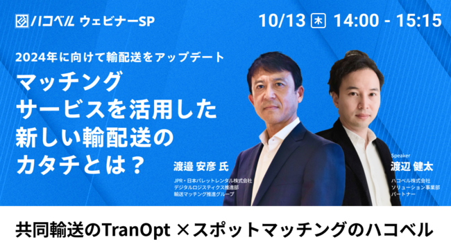 物流プラットフォーム「ハコベル」を展開するハコベル株式会社(本社:東京都品川区、代表取締役社長CEO:狭間 健志、以下:ハコベル)は10月13日(木)に、JPR・日本パレットレンタル株式会社 デジタルロジスティクス推進部 輸送マッチング推進グループ 渡邉 安彦氏をお迎えし「2024年に向けて輸配送をアップデート マッチングサービスを活用した新しい輸配送のカタチとは?」を開催することをお知らせいたします。